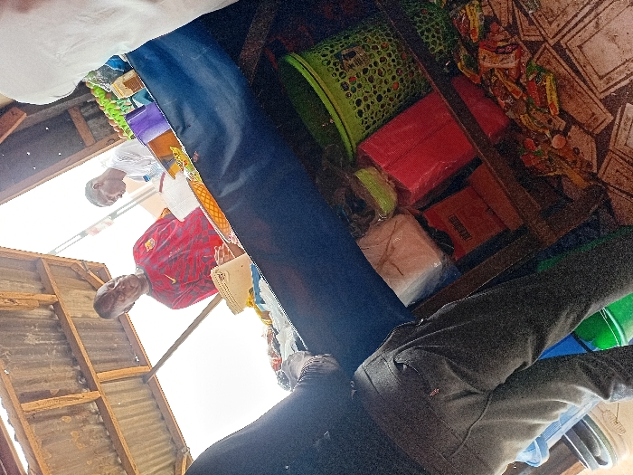 The image captures a ground-level perspective inside a market stall or small shop located in Dorayi, Nigeria