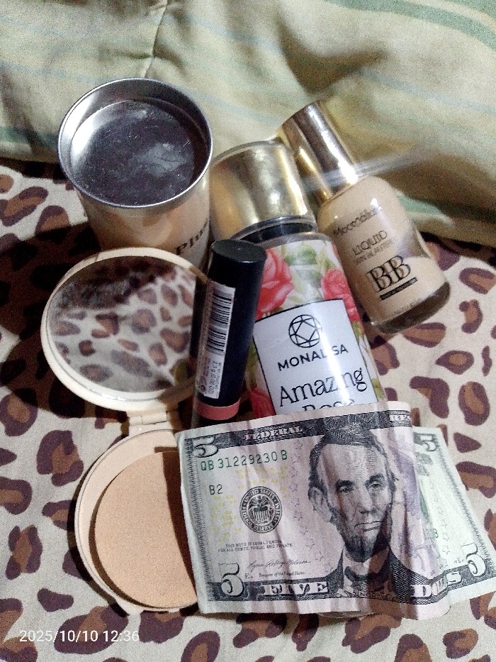 The scene displays an array of personal cosmetic items and currency arranged on a leopard-print surface, which partially covers a light green, striped fabric. In the foreground, a crumpled US five-dollar bill (serial number QB 31229230 B) is positioned. To its left, an open, circular beige compact reveals pressed powder and an internal mirror reflecting the leopard print. A black-cased lipstick with a visible peach/coral tip stands upright between the compact and a spray bottle. This bottle, labeled "MONALISA Amazing Rose" with a floral design, features a gold pump and cap. To its right, a "Moondial LIQUID SKIN BLASTER BB" foundation bottle with a gold pump top leans diagonally. In the upper left, a cylindrical container with a silver metallic lid is partially visible. No people are present. The items are static. The image is timestamped "2025/10/10 12:36". The location is an indoor, unidentifiable setting in Unknown, Unknown.