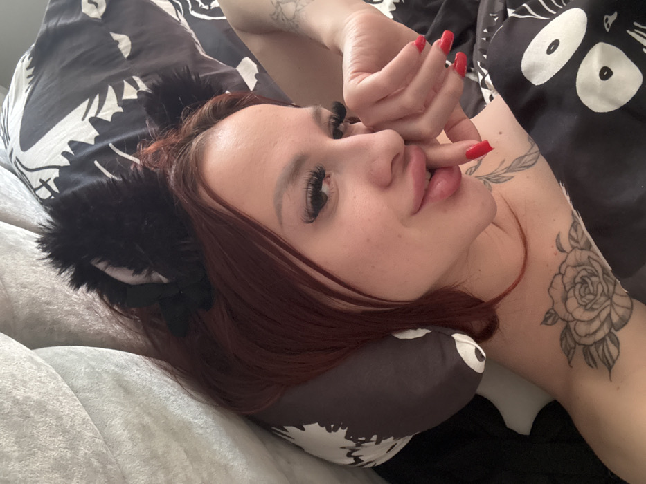 A female individual with reddish-brown hair, adorned with a black furry headband resembling animal ears, is depicted in a close-up, slightly overhead shot. She is lying on what appears to be a bed or sofa, with a light grey, textured surface visible to her left and black bedding featuring a white abstract pattern partially covering her lower body. A dark pillow with a white, eye-like design is positioned behind her head. Her facial features include long, dark eyelashes, full lips (appearing augmented), and light-toned skin. Her right hand is brought to her mouth, with the index finger touching or partially inserted between her lips. Her fingernails are long and painted bright red. Visible on her left shoulder/chest is a black and grey tattoo of a rose, with vine-like elements extending upwards. The precise geographical location, including Перовское сельское поселение, Ukraine, is not discernible from the provided image. No other individuals or direct interactions are visible.