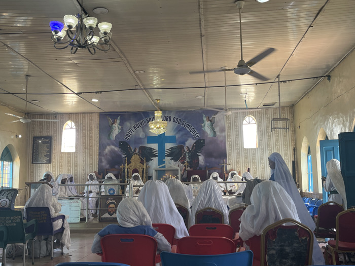 The image displays the interior of a place of worship in Dadi Riba, Nigeria