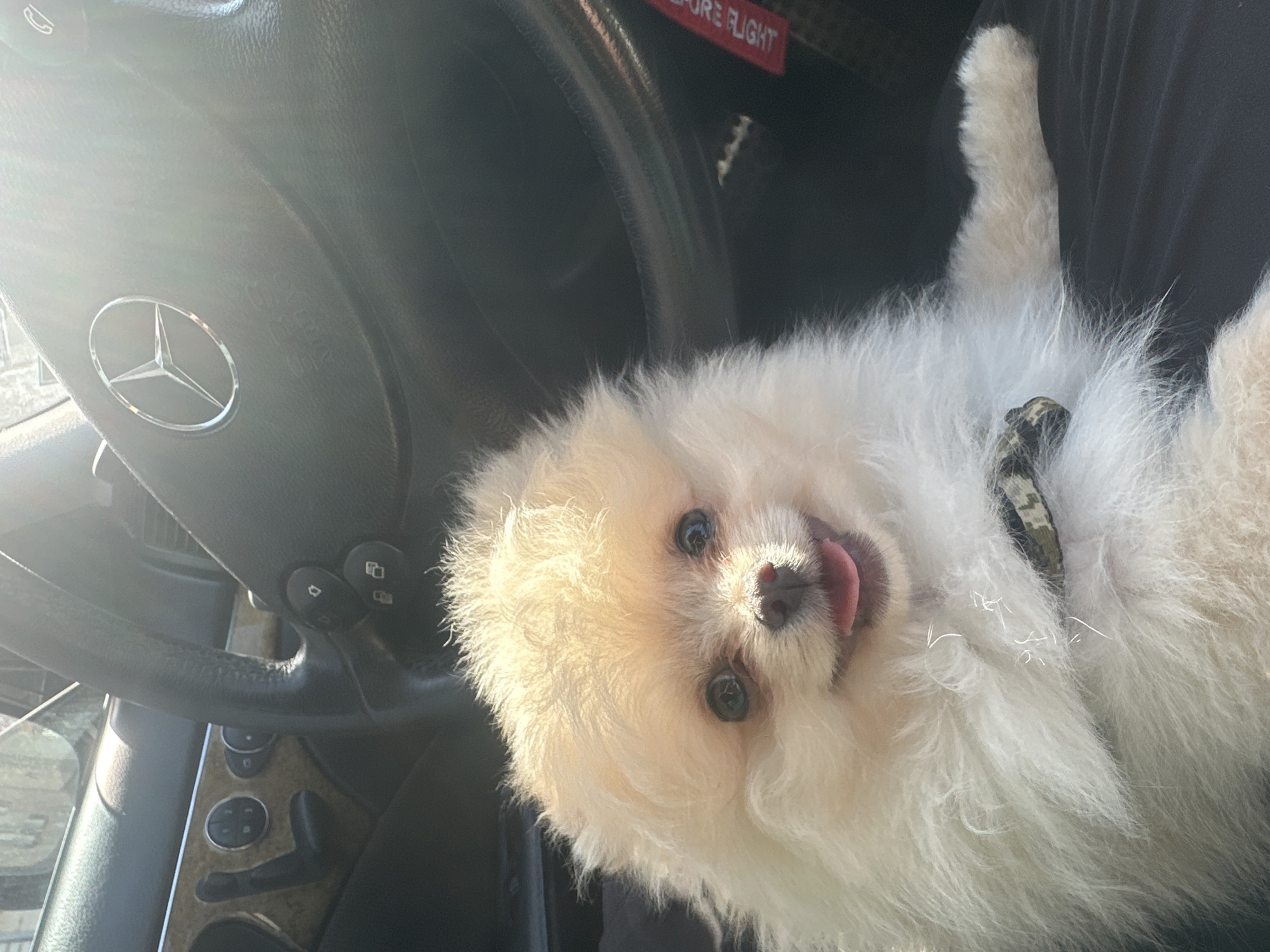 The scene is set inside the cabin of a Mercedes-Benz vehicle, located in Varna, Bulgaria, under bright daylight conditions. The primary subject is a cream-colored Pomeranian-type dog, centrally positioned and facing forward. The dog exhibits an open mouth with a visible pink tongue and dark eyes directed forward. A camouflage-patterned collar is visible around its neck. The dog rests on a dark, possibly black, fabric surface. The vehicle's interior features include a black leather steering wheel with a prominent silver Mercedes-Benz emblem in its center and "SRS AIRBAG" text below it. Control buttons are visible on the right side of the steering wheel. To the left of the steering wheel, a section of the dashboard with a wood-grain trim and circular control buttons is apparent. A red "REMOVE BEFORE FLIGHT" tag is partially visible near the steering wheel column on the right side of the frame. Direct sunlight illuminates the interior, causing reflections on various surfaces.