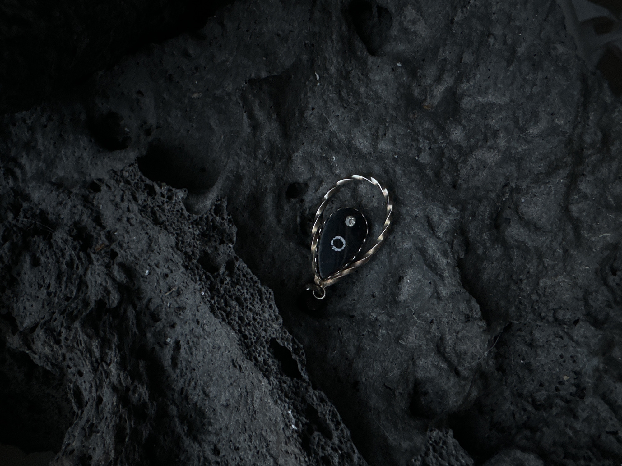 teardrop-shaped pendant resting on a dark, porous surface resembling volcanic rock. The pendant has a silver-colored twisted wire frame surrounding a black stone or glass insert. Two small, circular white markings are visible on the black insert, one near the top and one near the bottom. The pendant appears to be lying on a natural dark stone surface. Given the lighting and texture of the stone, the location of the city of Riga, Latvia cannot be determined based on only the image, as there are no clear identifying landmarks or features within the photograph.