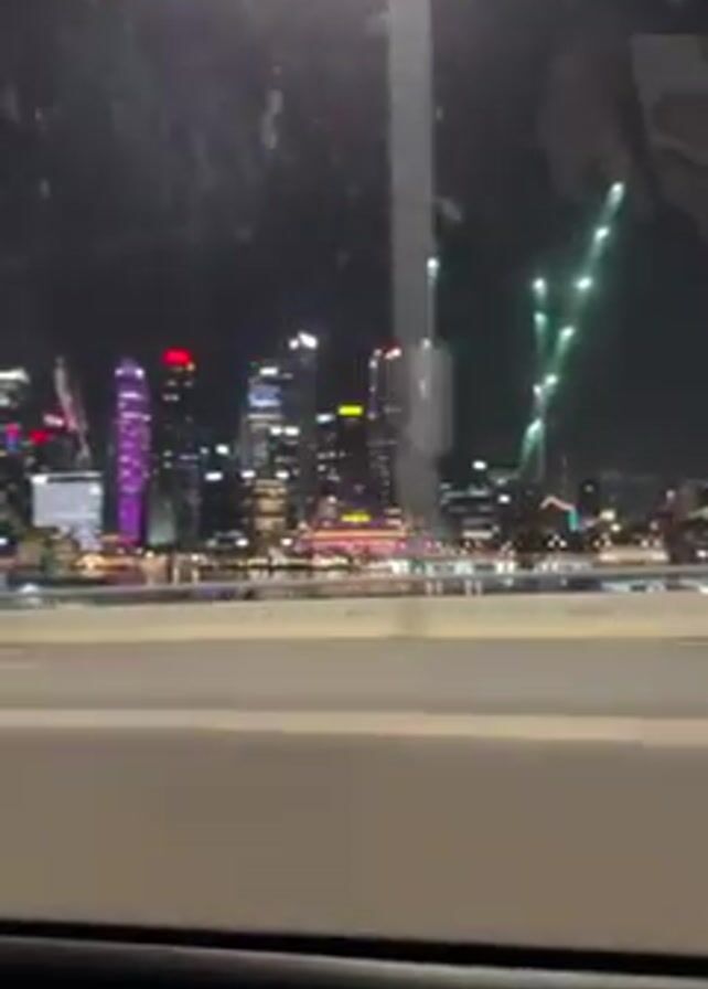 night view of a city skyline from inside a moving vehicle. The city buildings are illuminated with various colors, including pink, red, and yellow. Construction cranes are visible, their lights highlighting their structures. The road in the foreground appears smooth and well-lit. The overall lighting is low, typical of a night scene. The camera is positioned inside a car, looking out through the windshield at the city. There are no people visible inside the car.