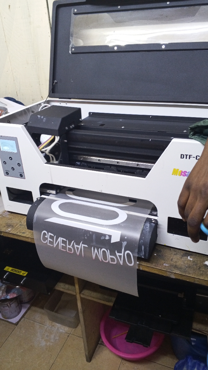 n indoor view of a printing workshop in Nairobi, Kenya. A white Direct-to-Film (DTF) printer, labeled "DTF-C" and partially "MOSAI," is the central subject, positioned on a dark wooden workbench. The printer's top cover is open, revealing internal mechanisms and a rectangular clear panel. On the left side of the printer, a grey control panel with black buttons and a small display screen is visible. A roll of grey film is being fed through the front of the printer, displaying mirrored white text, including "GENERAL WORLD," indicating an ongoing printing process. A dark-skinned human hand is visible on the right side of the printer, near the film output. The workbench surface is worn and shows markings. Below the workbench, a light-tiled floor is visible, along with a white bucket, a brown plastic container, and a pink plastic basin holding dark objects and a yellow stick. The background consists of a light-colored wall.