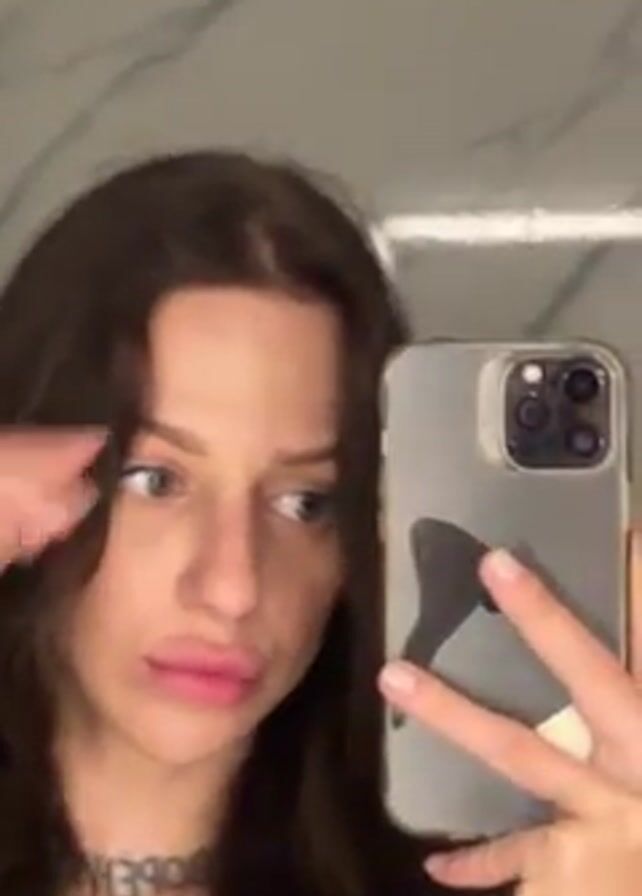 A woman with brown hair and fair skin is taking a selfie in a bathroom. She is holding her phone in her right hand, and the camera is pointed at her face. The woman touches her hair, and then she puckers her lips and winks. She is wearing a necklace, and a tattoo is visible on her neck. The bathroom has a marble-like wall.