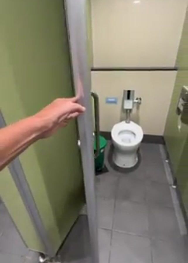 A person's arm and hand are shown in the foreground, pushing open a bathroom stall door with a metal handle and frame