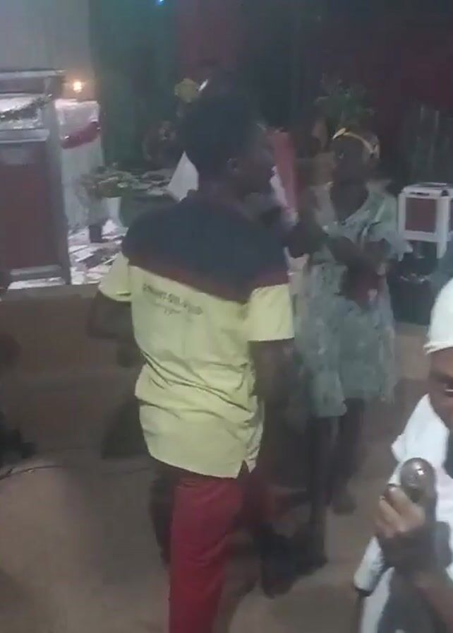 group of people dancing, with some holding microphones. A woman with a white headscarf appears to be singing or speaking into a microphone. A man wearing a shirt with the words "Emant Oil & Gas" on the back is also dancing. The scene takes place in what looks like a decorated indoor space, possibly a church or a community hall, with some furniture and decorations visible in the background. The lighting is somewhat dim.