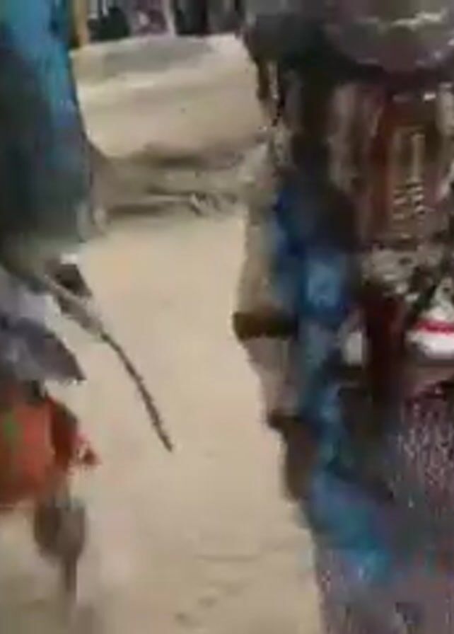 group of traditionally dressed people performing in what appears to be a public space, likely a village. Three primary figures are heavily costumed in masks and colorful, patterned clothing, including skirts and tops. They are moving energetically, suggesting a dance or ritualistic performance. One of the figures stumbles or falls, causing the other two to move around them. Onlookers, including adults and children, are visible in the background, watching the performance. The ground is sandy and there are some trees in the vicinity. The overall atmosphere seems festive and celebratory.