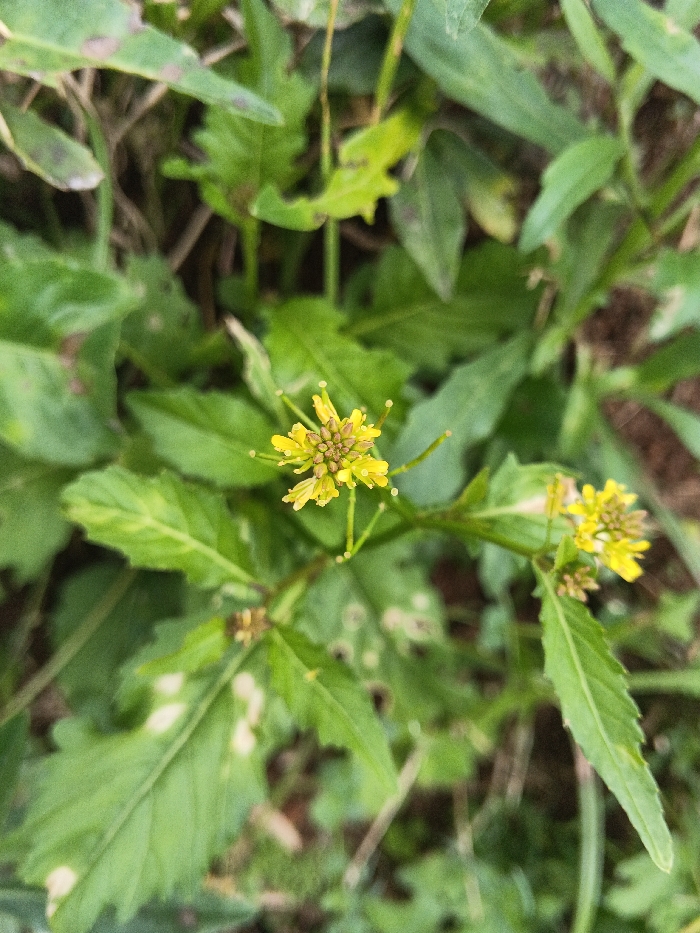 This forensic description details a close-up, high-angle view of a herbaceous plant within the city of Makilala, Philippines. The primary subject is a cluster of small yellow flowers, approximately 1-2 centimeters in diameter, located in the upper central portion of the frame. This main inflorescence consists of numerous tiny yellow petals, subtended by developing buds. A secondary, smaller cluster of similar yellow flowers is visible to the right. The plant exhibits multiple green leaves of varying shapes, some appearing lanceolate or spatulate with visible venation. Several leaves display irregular patches of lighter green or whitish discoloration, consistent with depigmentation or necrosis. The immediate environment consists of dense green foliage, with blurred background elements suggesting additional vegetation and indistinct dark brown earth. No human subjects, animals, or man-made objects are present. The scene is static, under natural, diffused lighting conditions.