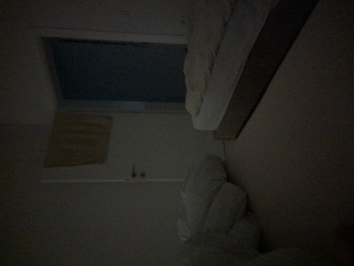 A dimly lit bathroom features a bathtub with a window above. A yellow washcloth hangs on the side. Next to the tub, crumpled white towels are stacked. A bed frame is visible at the top, partially obscuring the view. The overall impression is one of darkness and limited visibility.