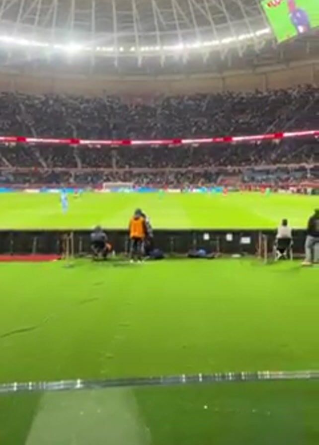 soccer game at night in a packed stadium with bright lights. The game is in progress on a green field, with players wearing green and blue uniforms. The crowd is dense and fills the stadium seating. A large screen hangs above the field, displaying the game feed. In the foreground, there's a line of equipment and personnel along the edge of the field, including cameramen, staff wearing orange vests, and chairs. The camera angle is from behind these personnel, providing an unobstructed view of the game and stadium.
