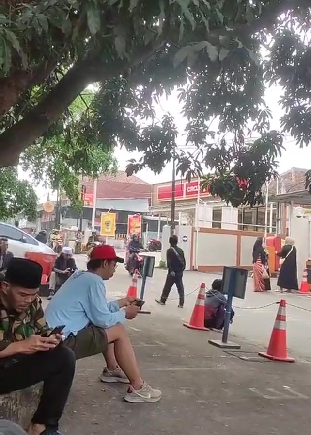 street scene under the shade of a large tree. Several people are sitting on a low concrete barrier. A man in a red cap and blue shirt is holding and looking at what appears to be a handheld gaming device. Next to him, a man in a camouflage jacket and a black cap is looking at a smartphone. In the background, there's a convenience store with a red "CIRCLE" logo. People are walking and riding motorcycles on the street, navigating around orange traffic cones and barriers.