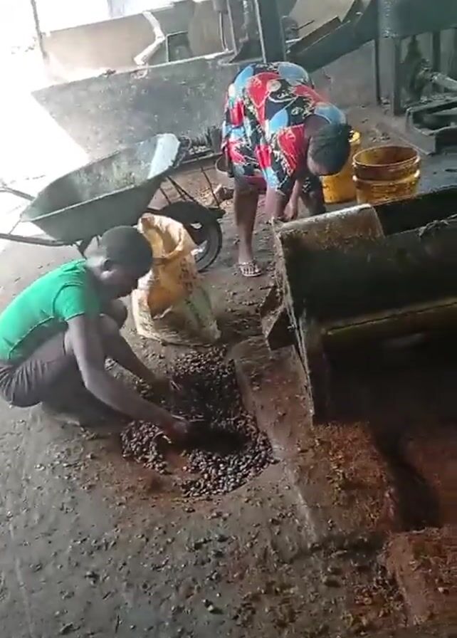 In an indoor workspace, a man in a green shirt squats, using half of a cabbage-like object to gather and place small, dark brown nuts, seemingly from a pile on the concrete floor, into a sack. A woman in a patterned dress stands nearby, also appearing to handle and sort nuts near a metallic machine. A wheelbarrow is visible in the background. The environment is somewhat cluttered and industrial.
