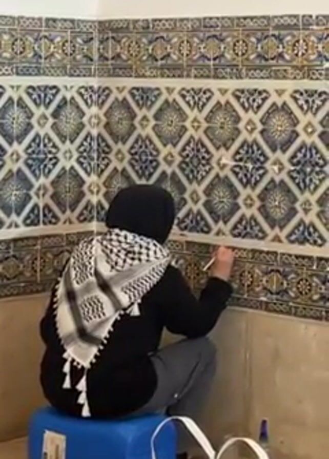 A person wearing a headscarf and keffiyeh, dressed in a black top and gray pants, is squatting on a blue plastic container and meticulously painting a section of a wall adorned with intricate blue, yellow, and white patterned tiles