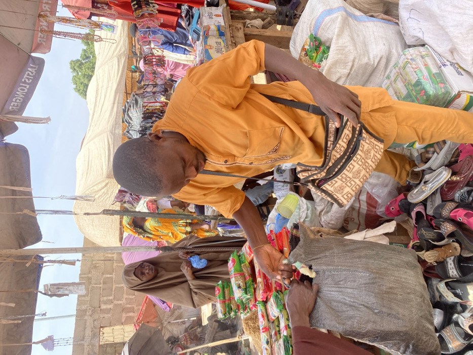 The image depicts an active outdoor market scene in Kakuri Gwari, Nigeria, under bright daylight