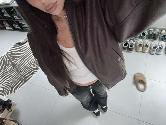 An individual stands indoors on a light grey tiled floor in Tielrode, Belgium, captured from an overhead perspective. The person wears a dark brown zippered jacket, partially unzipped over a white ribbed tank top that exposes a segment of the midriff, dark-wash jeans, and black sneakers with white laces. Long dark hair is visible, and the lower portion of the face, including lips with nude-toned lipstick, is present. A thin silver-colored necklace is also visible. To the individual's right, a single beige furry slipper rests on the floor, while approximately 10-12 pairs of various athletic shoes are arranged in a line against a wall further in the background. To the left, a brown and white zebra-print rug is partially visible on the floor. In the upper left background, a dark multi-compartment shoe rack containing shoes is partially observed, and in the lower left, a wooden crate holds dark fabric items.