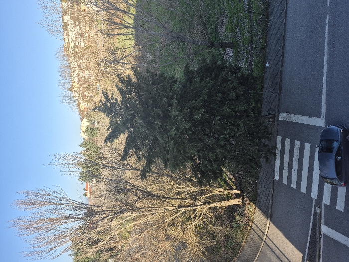 An elevated view captures an urban scene in Bragança, Portugal, under a clear blue sky. In the foreground, an asphalt road features a clearly marked white pedestrian crosswalk and an 'L' shaped white line. A dark-colored hatchback automobile is stationary, positioned partially over the white line markings of the crosswalk, facing towards the left. A paved sidewalk runs parallel to the road on the right. The midground is dominated by a prominent, dark green conifer tree, flanked by several bare deciduous trees. Beyond the sidewalk, a grassy area with sparse ground cover is visible. In the background, a hillside rises, densely populated with numerous light-colored buildings and houses, interspersed with vegetation. Long shadows cast by the trees indicate direct sunlight. No individuals are present.