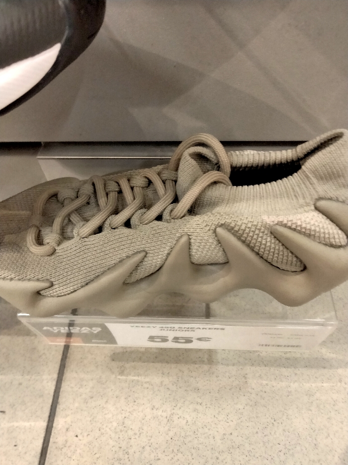 A single Yeezy 450 sneaker in a muted earth tone sits on a clear plastic shelf. The sneaker features a knit upper with unconventional lacing and a unique, sculptural midsole. A partially visible tag underneath the shoe advertises "Yeezy 450 Sneakers Juniors" for 55€. A second shoe of different style is partially visible in the upper left corner of the shot. The background and foreground are tiled, adding a sense of a retail environment.