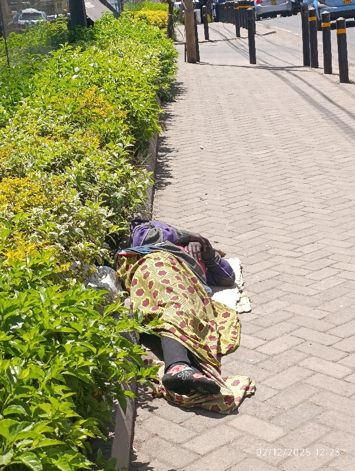 - "An individual is observed lying on their right side on a light-colored cardboard sheet on a paved sidewalk in an urban area of Nairobi, Kenya" by FM-R7nA43, licensed under CC BY 4.0