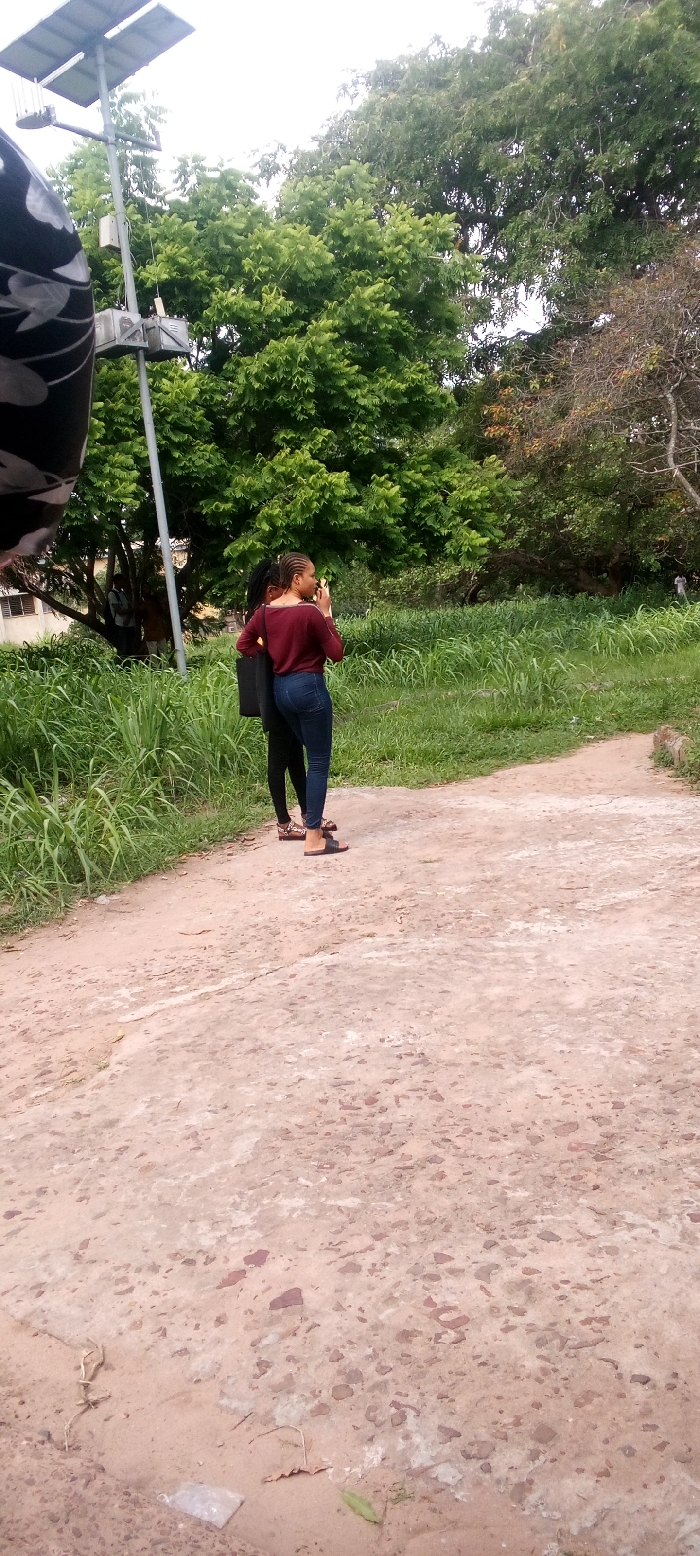 two young women standing on a dirt path in Okigwe, Nigeria (coordinates: 5.824, 7.396). They are facing away from the camera, looking to the right. The woman on the left is wearing a black shirt and black pants, while the woman on the right is wearing a maroon shirt and blue jeans. The woman on the right is holding a black purse. They are standing on a dirt path, surrounded by tall green grass. In the background, there are several trees, and a metal pole with solar panels on top. The path is made of loose gravel. The women appear to be engaged in conversation. The image is likely taken in the afternoon, as the sun is shining and the shadows are relatively short. The camera angle is slightly tilted upwards. The image is likely taken with a mobile phone camera, as it is slightly blurry and the resolution is low.
