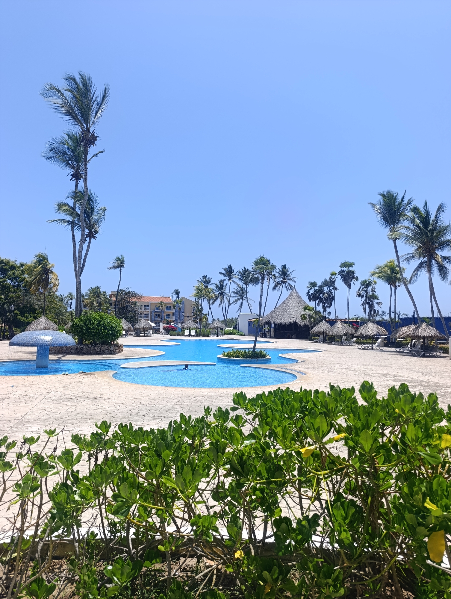 The image depicts a swimming pool complex at an outdoor resort in Unknown, Unknown. The pool is multi-shaped, with various circular sections connected by shallower areas. The pool surface is blue, and the surrounding area is paved with light-colored tiles. There is a small island with vegetation in the center of one section of the pool. In the distance, there is a building with light-colored walls and a red roof. Several palm trees and thatched umbrellas surround the pool area. The foreground is dominated by a dense shrub with green leaves and yellow flowers. The sky is clear and blue. There is a person swimming in the pool.