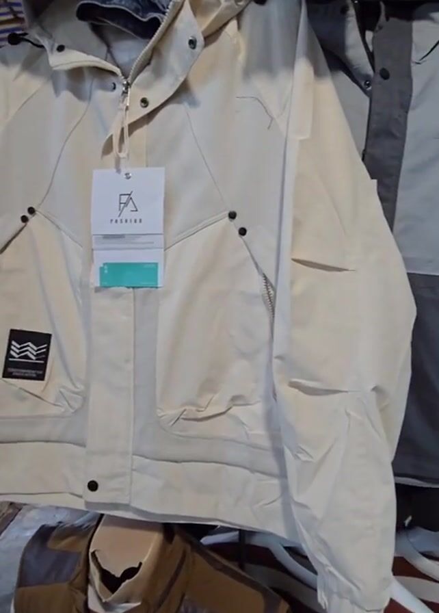 display of jackets and shirts on hangers in a retail environment. The camera pans from left to right, showcasing a variety of outerwear in different colors and styles, including a beige hooded jacket with the brand "FASHION", a gray and blue color-blocked jacket labeled "BI.ADEEP", and a black jacket with a white stripe. Several striped shirts and a brown vest are visible on hangers below the jackets.