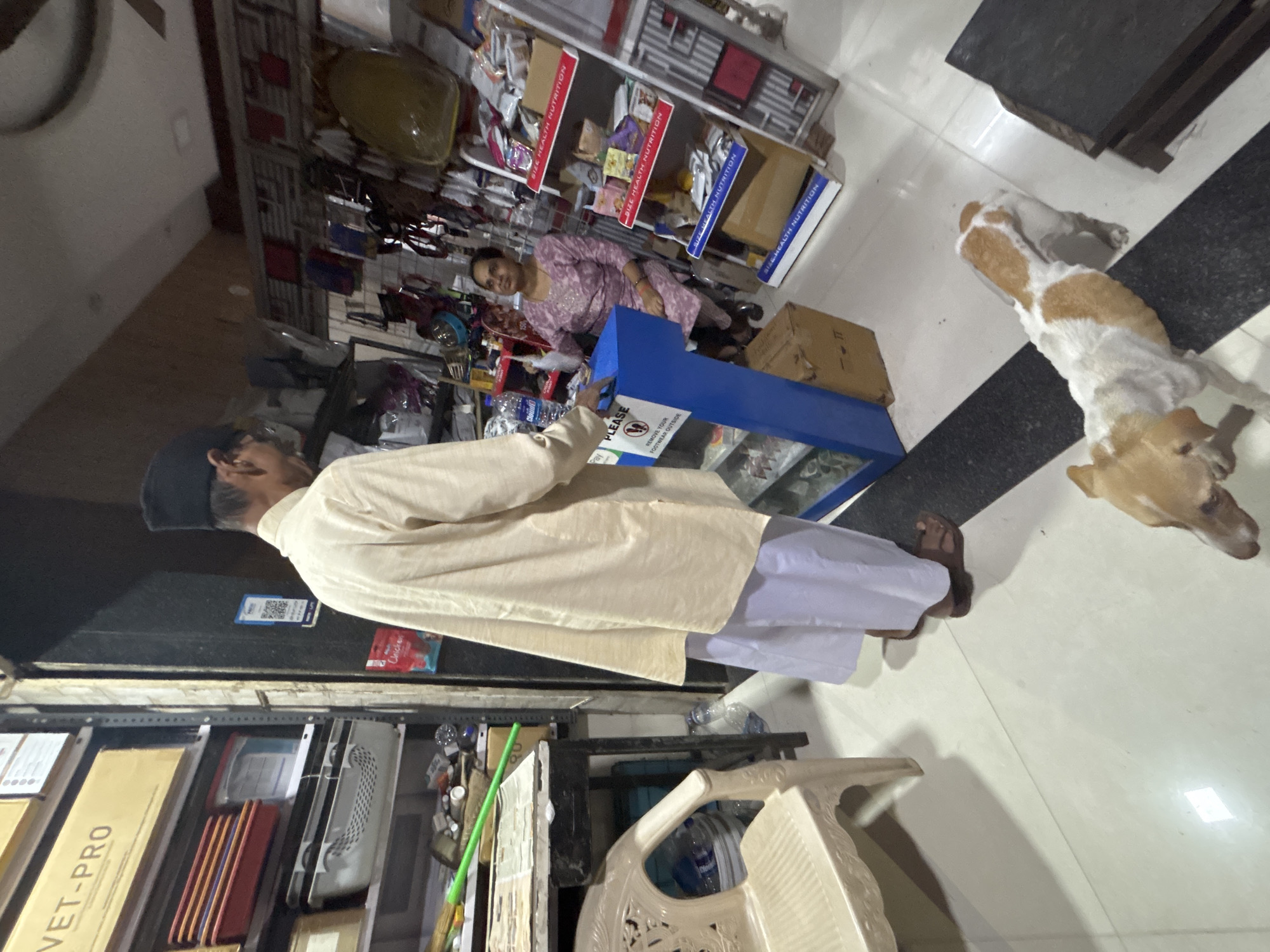 The image depicts the interior of a retail establishment in Ambernath, India, likely a pet supply store. In the foreground, a light brown and white dog stands on a white tiled floor bisected by a black strip. A male individual, positioned with his back mostly to the camera, stands near a blue, narrow counter or display stand. He wears a light-colored long shirt (kurta), white trousers, dark sandals, and a black cap. He is looking towards the blue stand, which displays "Pay PLEASE" and "REMOVE YOUR FOOTWEAR OUTSIDE" text. A brown cardboard box rests at the base of this stand. Behind the blue stand, a female individual is seated, facing towards the left. She wears a patterned purple dress and holds a white object in her left hand. To the left of the frame, a light-colored plastic chair and a dark table are visible, featuring papers and a green broom handle. Behind these items, shelving units contain various products, including boxes labeled "VET-PRO" and assorted containers. To the right of the scene, multiple white metal display racks hold packaged products, several marked "SIZE HEALTH NUTRITION," along with a variety of pet accessories hanging on a wall grid. A QR code is visible on a dark panel in the background. The ceiling shows a fan.