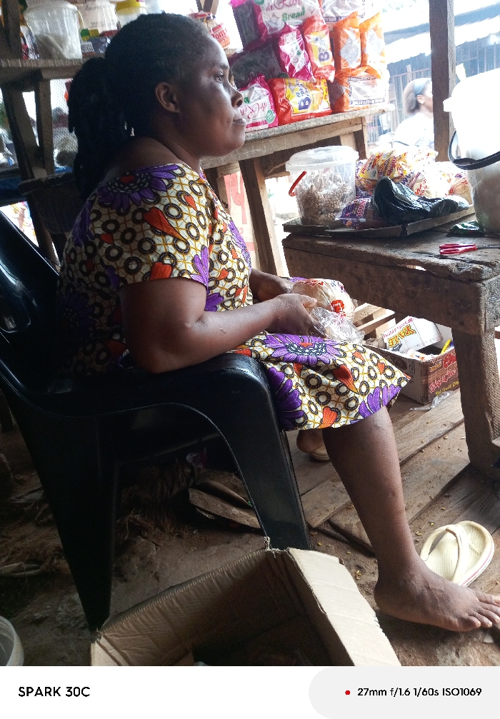 A woman sits on a black plastic chair. She is wearing a colorful dress with floral patterns. She is in profile, looking to the right. Her hair is pulled back in a ponytail. She appears to be working, possibly packaging items on a cluttered table in front of her. Packaged goods are stacked on a shelf behind the table. A cardboard box sits on the ground near her feet. She is barefoot, with one flip-flop nearby.