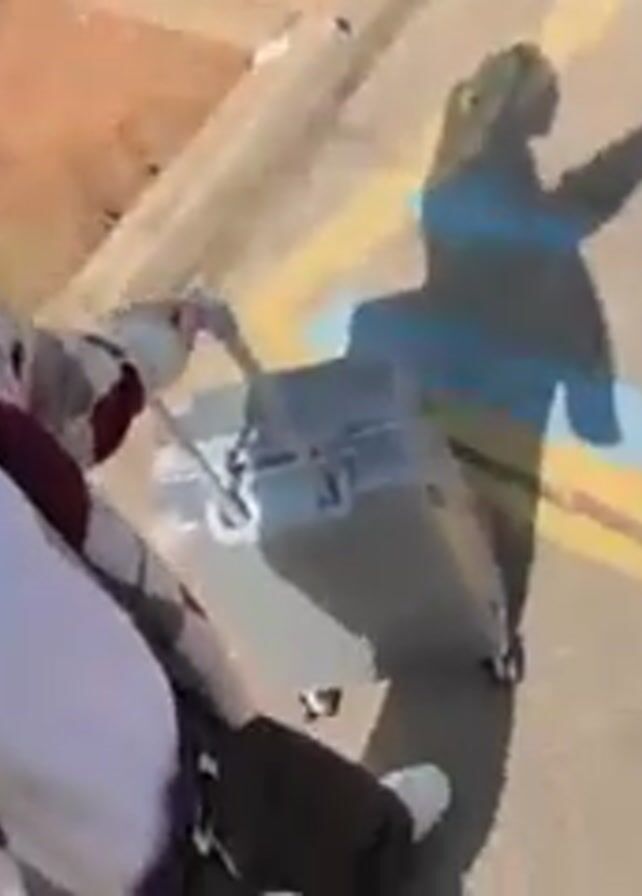 A person with reddish-brown hair and sunglasses is outdoors. They are wearing a white t-shirt and a patterned cardigan. The person is pulling a light-colored, ridged suitcase across a concrete surface. The surface has a yellow and blue painted square on it. In the background, there is a building, shrubbery, and a small wooden structure. The camera appears to be held by the person.