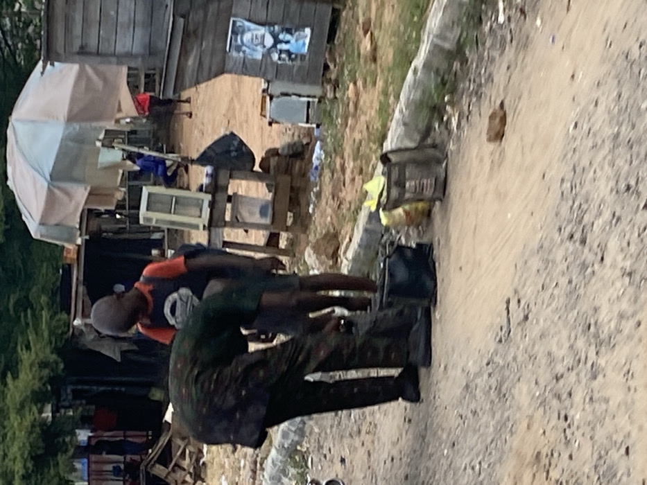 This image captures an outdoor scene in Adankolo, Nigeria. In the foreground, an adult male in dark, patterned clothing is bent over, examining an object near a black bag on the unpaved dirt ground. A younger male, wearing an orange shirt with a black overlay, stands beside him, observing. To their right, two additional bags, one yellow and one grey/brown, rest on the ground adjacent to a grey concrete curb. In the mid-ground, a wooden stand displays a light-colored rectangular object, possibly a window frame, and a dark bag. Beyond this, a large, multi-paneled umbrella or canopy provides shade. Under the canopy, a person in blue clothing is seated, while another person in red stands nearby. To the far right, a small wooden structure features a poster affixed to its side, depicting multiple individuals, including an older man's portrait. The background contains various other rudimentary structures and green foliage.