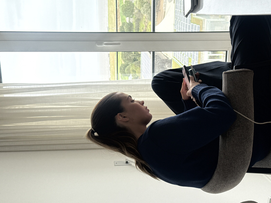 A young adult female is observed seated indoors in Loures, Portugal, facing towards the right with her head slightly bowed. Her brown hair is pulled back into a high ponytail. She wears a dark blue long-sleeved top and dark trousers. An earring is visible in her left ear. She occupies a gray, textured armchair with a curved backrest. In her hands, she holds two electronic devices: a smartphone with a pink rear casing, which she is interacting with using her right thumb, and a dark green portable power bank, which appears connected to the smartphone. A white charging cable is visible extending from her lap. To her right, a large window with a white frame provides a view of an exterior landscape under an overcast sky. The distant horizon suggests a body of water or expansive flat terrain. Below, green foliage and scattered trees are visible, along with the roof of a building covered in solar panels. A translucent, light-colored curtain hangs along the window frame on the right side. The interior wall to her left is white, with a white wall-mounted fixture partially visible.