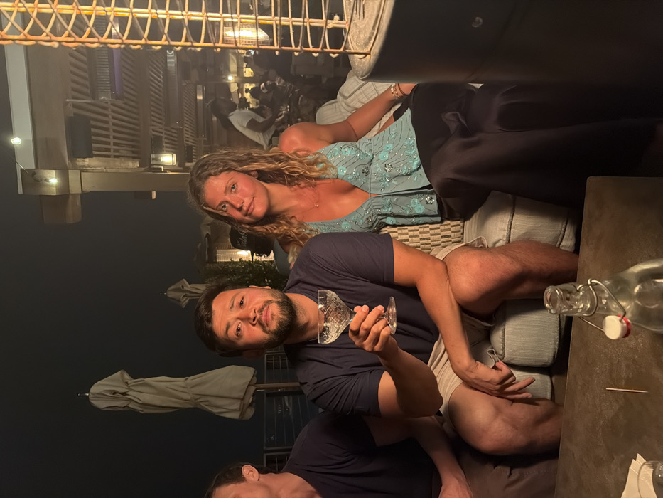 This nighttime image depicts an outdoor lounge or dining area at an upscale establishment in Malibu, United States of America. Three individuals are seated on a light-colored, padded outdoor couch in the foreground. The central male subject has short dark hair and a beard, wearing a dark blue t-shirt and light-colored shorts. He holds a clear, patterned stemmed glass in his right hand and looks directly at the camera. To his right, a female subject with wavy light brown hair wears a light blue, heavily beaded and embroidered sleeveless top with a plunging neckline, and dark, wide-leg pants. She is also looking towards the camera with a slight smile. Partially visible on the left is another male subject in a dark blue t-shirt. On a dark-colored table in front of the subjects, a clear glass swing-top bottle with a white ceramic stopper and a red gasket is present, along with a small wooden toothpick. The background reveals a dark night sky. Overhead, a wooden pergola structure with string lights is visible. Several large, beige folded outdoor umbrellas are positioned behind the central male subject, suggesting an open-air setting. A tall, wicker-patterned outdoor patio heater, emitting a warm glow, is prominently positioned on the far right of the frame. Further in the background, numerous indistinct figures are visible, some seated at tables, illuminated by ambient lighting, indicating a busy social environment.
