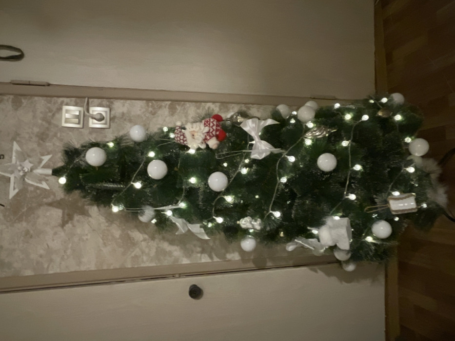 - "A Christmas tree lies horizontally, adorned with white spherical ornaments, sparkling lights, and white ribbons" by FM-aSc183, licensed under CC BY 4.0