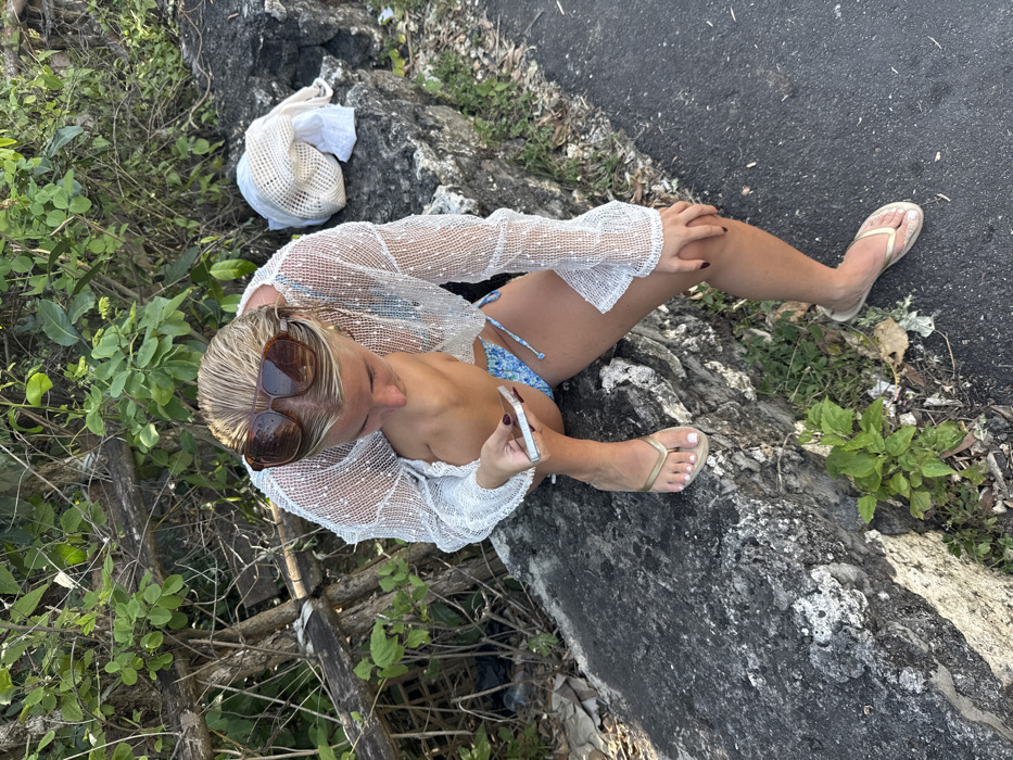 A woman with blonde hair and sunglasses sits on a stone ledge, looking at her phone. She wears a white, open-weave cover-up over a blue and white bikini. Her legs are bent, with one foot on the ledge and the other on the ground, both in gold flip-flops. Behind her is a fence line and dense greenery. A white mesh bag rests on the ledge beside her. The edge of a paved road is visible to the right.
