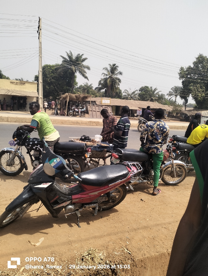 The image depicts a bright daytime street scene in Ube, Nigeria