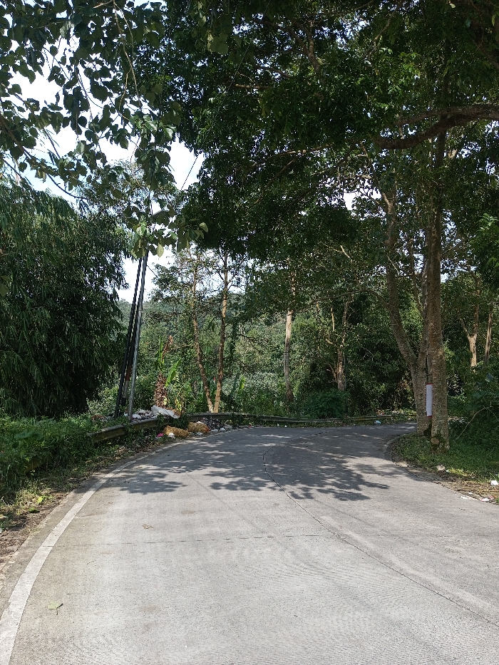 This image depicts a sunlit, concrete road winding through a lush, verdant environment in Sandamal Eliya, Sri Lanka. The road curves right and slightly uphill, featuring a single solid white line marking its left edge. Dense foliage from numerous trees forms a canopy overhead, casting prominent shadows across the road surface. To the left of the road, a metal guardrail is partially obscured by overgrown green vegetation and a collection of debris, including what appears to be discarded items. Behind the guardrail, multiple utility poles with attached lines ascend vertically. Further back, a dense forest covers rolling hills or mountains. To the right of the road, more large trees with visible trunks and abundant green leaves line the edge, with a white, rectangular object affixed to one tree trunk. The sky, visible in patches through the tree canopy, is clear. There are no individuals, vehicles, or animals present, and no discernible actions or interactions are occurring. The scene is illuminated by natural daylight.