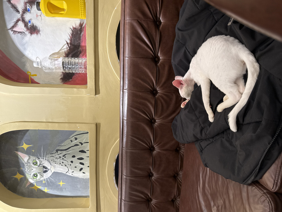 - "An indoor scene within Hòa Cường Ward, Vietnam, depicts a white, short-haired cat lying asleep or resting on a folded black jacket or blanket, which is placed on a dark brown, tufted leather sofa" by FM-VtZBW2, licensed under CC BY 4.0