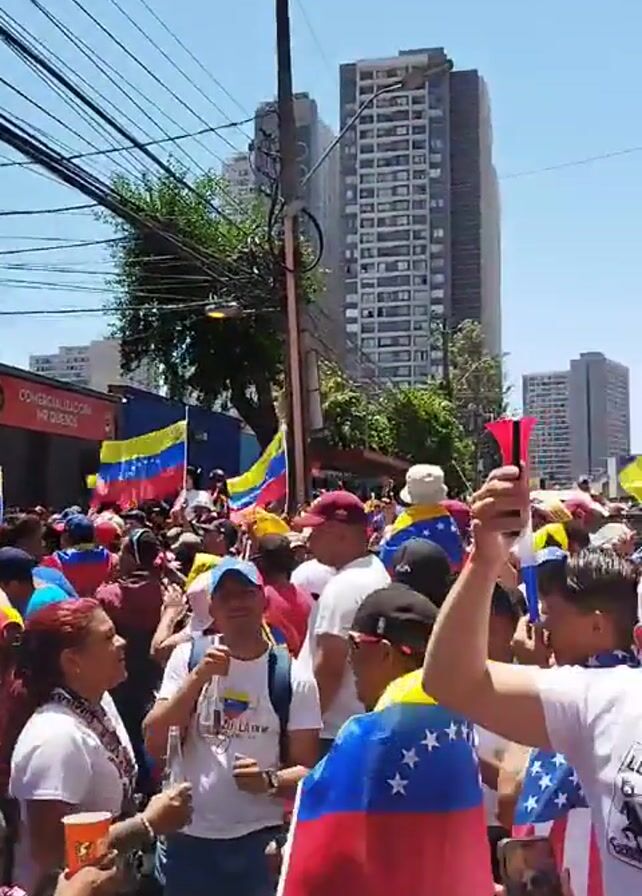 large crowd of people celebrating in the street. Many are waving Venezuelan flags, wearing Venezuelan-themed clothing, and carrying other paraphernalia such as a large red horn being played. The crowd appears to be on a city street lined with apartment buildings and commercial properties. Shoes are hanging from powerlines overhead. The sky is blue and clear, suggesting a sunny day.