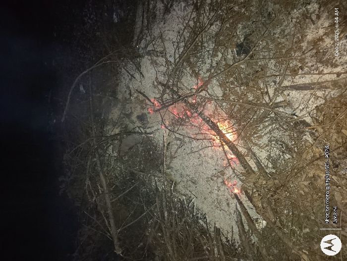 The image depicts an outdoor scene at approximately 6:44 AM on December 2, 2025, in Ozark, United States. The environment is dark, indicating pre-dawn or nighttime conditions. A low-intensity, smoldering fire is present on the ground, characterized by glowing red embers without significant visible flames. The combustion is consuming a collection of dry, dark tree branches, twigs, and other organic debris. Surrounding the active burn area and intermingled with the fuel is a substantial accumulation of light-colored, granular material consistent with ash from prior combustion. No individuals, animals, or artificial structures are visible within the frame.