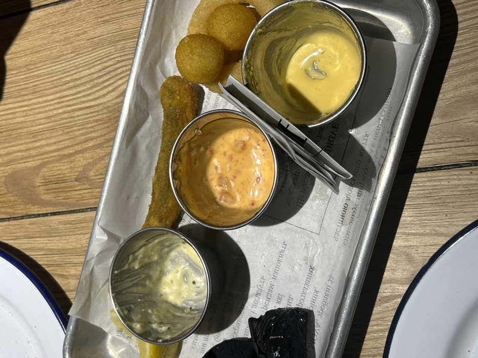 A metallic serving tray, lined with white paper displaying black Cyrillic text, rests on a light brown wooden table. The tray contains various food items and condiments. Three small, metallic ramekins are present: the leftmost holds a partially consumed, speckled light yellow sauce; the middle contains an orange-red sauce with red flecks; and the rightmost features a yellow sauce with a distinct utensil mark. A yellow lemon wedge is positioned to the left of the leftmost ramekin, alongside a dark, irregularly shaped fried object. A single, long, green, breaded and fried item, resembling a pickle spear, lies horizontally on the tray. Several spherical, yellow, fried items are visible to the right of the pickle spear. Partially visible white plates with dark blue rims are present in the top-left and bottom-left corners of the frame. The scene is located in a dining establishment in Slobozhanske, Ukraine.
