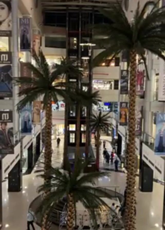 interior of a shopping mall with a multi-story atrium. Several tall palm trees are situated in the central area, with shoppers visible walking in the background. An elevator shaft is centered in the shot, extending to the top of the building. Storefronts and banners are visible on multiple levels of the mall. The floor is shiny and reflects the light.