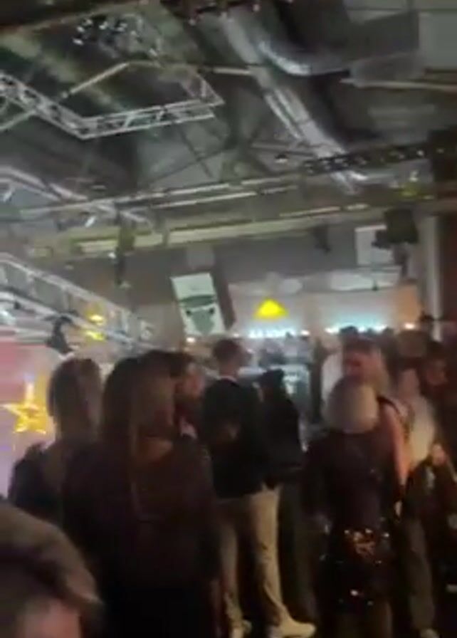 The video depicts a crowded indoor setting resembling a nightclub or event space. Many people are present, some standing in groups and others moving through the crowd. The environment has a high ceiling with exposed pipes and industrial-style lighting. There are flashing lights and other lighting effects contributing to the ambiance. A bar area is visible with people standing at the counter, and a bartender appears to be serving drinks. The camera moves through the scene, providing a general view of the event.