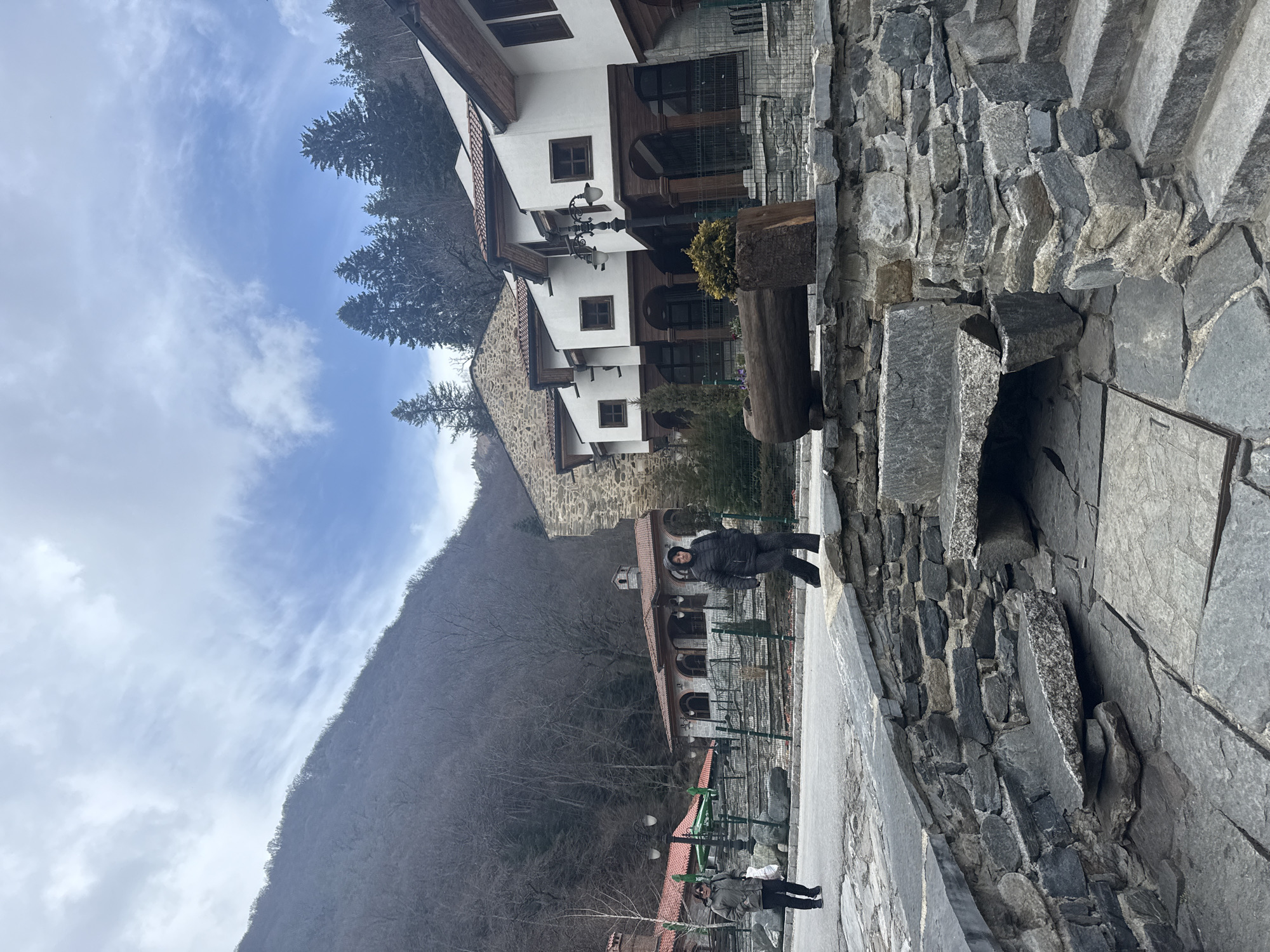 The image depicts a mountain town environment within Rilski manastir, Bulgaria, characterized by traditional architecture and natural surroundings under a partially cloudy sky. In the background, a steep mountain face dominates the left side, covered in bare deciduous trees, suggesting late winter or early spring. On the right, evergreen coniferous trees are visible on a less steep slope, extending behind structures. The sky features patches of clear blue interspersed with white, wispy clouds. The mid-ground features several buildings constructed with stone foundations and traditional elements. On the left, two single-story structures with red tile roofs, light-colored walls, and arched openings are visible, one featuring green awnings. To the right, a row of three multi-story buildings presents white upper facades with dark brown wooden accents and red tile roofs. These buildings have square, dark-framed windows and ground-level arched entrances supported by dark wooden columns. A decorative black lamppost with multiple lanterns stands prominently in front of these white-fronted buildings. A stone-built structure is partially visible further to the right. Low metal fencing separates these buildings from the paved area. The foreground and mid-ground consist of a grey paved surface, likely a road or plaza. In the immediate foreground, a multi-tiered stone structure functions as a retaining wall and includes a recessed area paved with irregular flat grey stone slabs. This structure incorporates stone steps on the far right and a large, flat stone slab spanning an opening within its lower section. A large, hollowed-out log planter, containing a small green shrub, rests on the upper part of this stone structure on the right side. Two female individuals are present on the paved surface in the mid-ground. The person on the left walks from right to left, wearing a dark jacket and trousers, carrying a white plastic bag in her left hand. The person on the right walks from left to right, wearing a dark hooded jacket and dark trousers. Both are walking independently without apparent interaction.