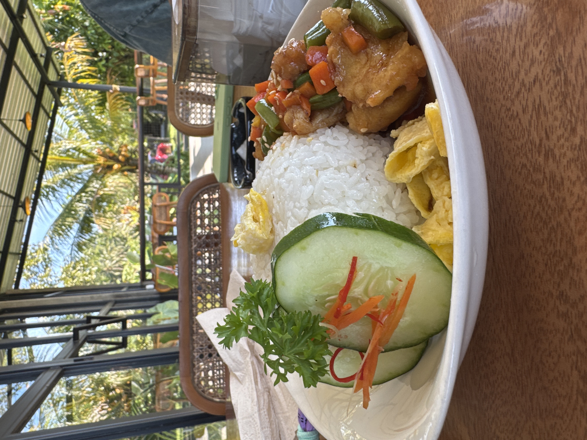 - "On a wooden table, a partially visible white dish of Indonesian food sits against a blurred backdrop featuring the open-air architecture and lush greenery typical of Tampaksiring, Indonesia" by FM-Ribsj1, licensed under CC BY 4.0