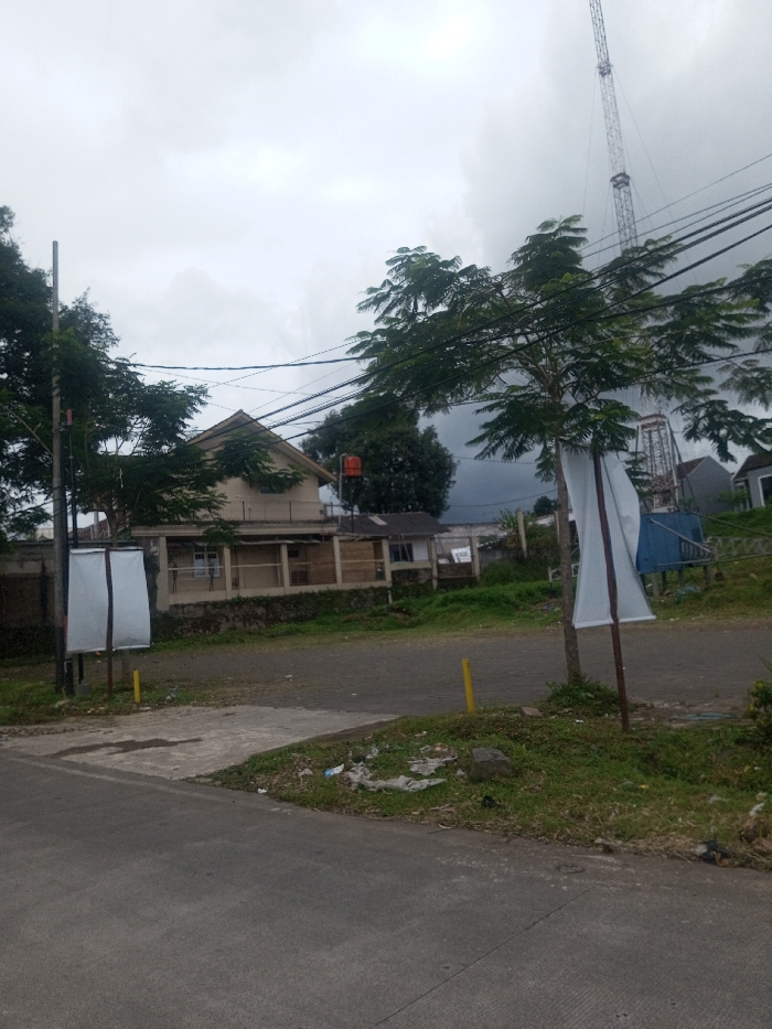 The image depicts an overcast outdoor scene in the city of Sarwahi Mal., India. A grey asphalt road occupies the foreground, curving to meet a lighter concrete patch on the left. No individuals are present. On the far left, a dark utility pole supports multiple overhead electrical wires. Adjacent to it, the back of a white rectangular sign mounted on a pole is visible. Centrally, a two-story, light-toned building with a brown gable roof and a second-story balcony is visible, with a stone retaining wall and fencing at its base, partially obscured by green trees. To the right, a small tree with green foliage bears a draped white fabric. Behind this tree, a tall, metallic lattice communication tower rises prominently into the cloudy sky. Partial views of additional residential structures, one with a blue section, are visible in the right background. Numerous dark power lines crisscross the upper portion of the frame. The grassy roadside in the mid-ground contains scattered debris and two short yellow marker posts.