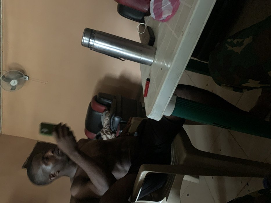 An indoor scene in Kado, Nigeria, features an adult male with a fade haircut, shirtless and wearing dark shorts, seated in a light-colored plastic chair on the left