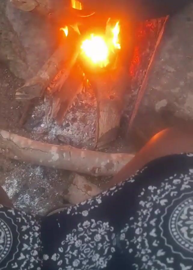 fire made of wood burning brightly in a traditional stove. A pot filled with water is placed on top of the stove to heat. The person recording the video is sitting in front of the fire, and their legs are visible in the frame. They are wearing dark pants with a white pattern. The area around the stove appears to be a simple outdoor setting, possibly in a rural location.