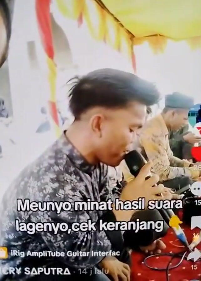 A man is singing into a microphone under a yellow and red tent. He is wearing a patterned shirt and has a modern haircut. Another man sits to his right in a tan jacket and hat. The text on the screen reads “Meunyo minat hasil suara lagenyo, cek keranjang” followed by “iRig AmpliTube Guitar Interface”. The video has social media icons for likes, comments, and shares. The environment seems to be an outdoor event.