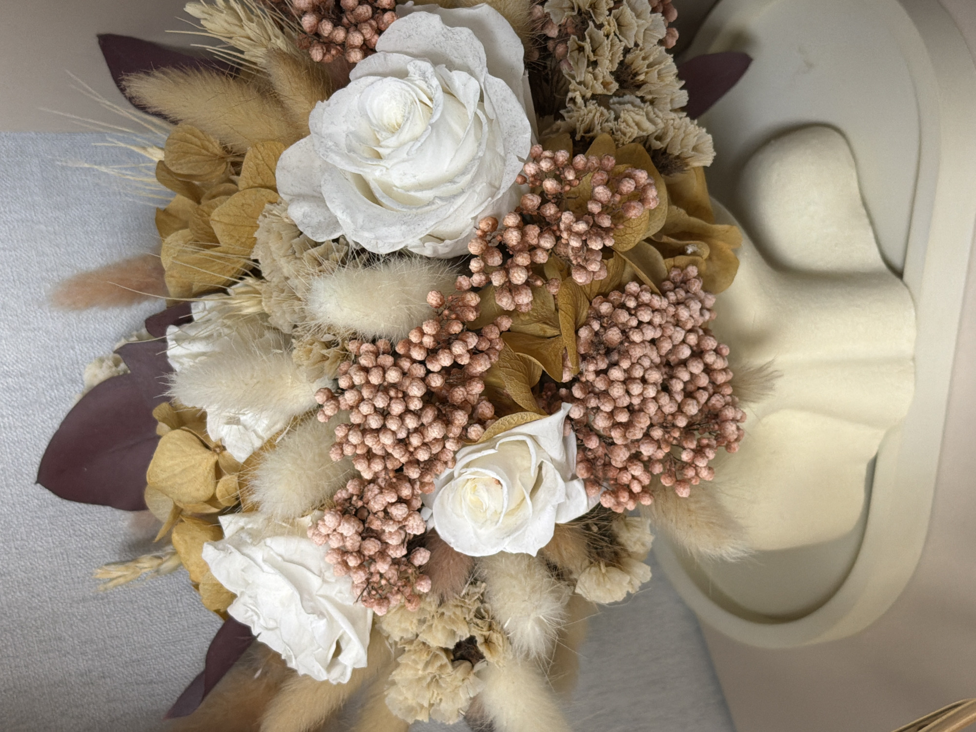 The image depicts a close-up of a floral arrangement. The arrangement includes white roses, small brown berry-like clusters, beige bunny tails, dried wheat stalks, and dried hydrangeas. A dark purple leaf is partially visible on the left side. The arrangement appears to be inside a container. A section of a cushioned off-white or light-beige object is visible to the right of the arrangement, possibly the lining of a box or container. The background is a light gray. There is no evidence in the image to suggest this is in Nizhnevartovsk, Russia.