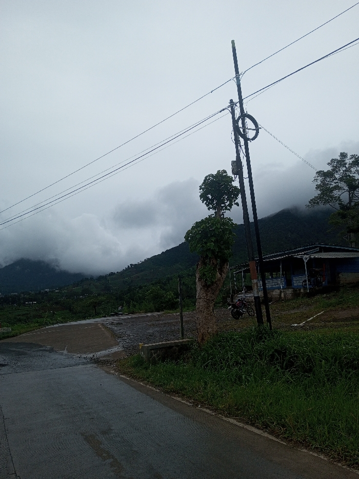 The image depicts a mountain landscape in Babaliya Mal., India, under a heavily overcast, grey sky with low-hanging clouds obscuring the upper reaches of the hills. A dark, damp asphalt road occupies the foreground, curving from the lower left towards the center. To the immediate right of the road is a strip of green grass and a low, grey stone retaining wall. A prominent tree trunk, from which fresh green foliage sprouts near its apex, stands in the mid-right. Adjacent to the tree is a dark utility pole, carrying multiple overhead power lines and a spool of black cable. Behind the pole and tree, a single-story building with a light blue exterior, a dark roof, and a covered front porch is visible. A dark-colored motorcycle with some red accents is parked in front of the building. Lush green hills, partially obscured by the clouds, form the background. No individuals are present in the scene.